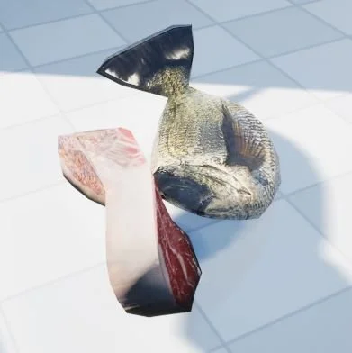 Chefish features a dynamic cooking system based on vertex paint values, allowing for realistic frying of foods where only surfaces in contact with heat elements will cook. This paint detection method allows for gameplay such as needing to flip burgers or steaks in order to cook on both sides before plating.