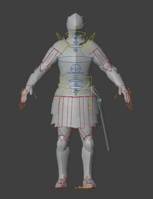 The armour pieces are separated meshes, in order to be able to move and deform more like real armour where pieces slide over one another rather than bending as a uniform piece. This requires very detailed weighting of each bone, particularly in places with many individual pieces such as the armour on the wrist and fingers.